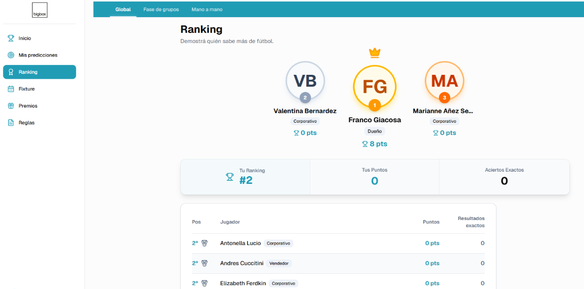 Pronósticos simples, ranking en vivo y un chat interno que mantiene la conversación activa.